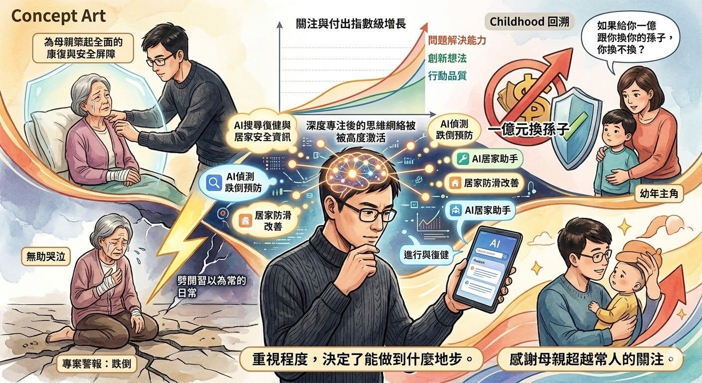 奇妙的是... 當我將其視為最重要的目標,我整個人像是被打開了開關,開始很自然地利用各種AI工具,積極搜尋討論各種復健與居家安全資訊;腦中關於如何改善、如何預防的點子和行動步驟,一個接一個地迸發出來。我不禁自問:為什麼以前我也很重視母親,卻從未想到這些?答案顯而易見:過去的「重視」,只是情感上的在乎,而非行動上的「專注投入」。