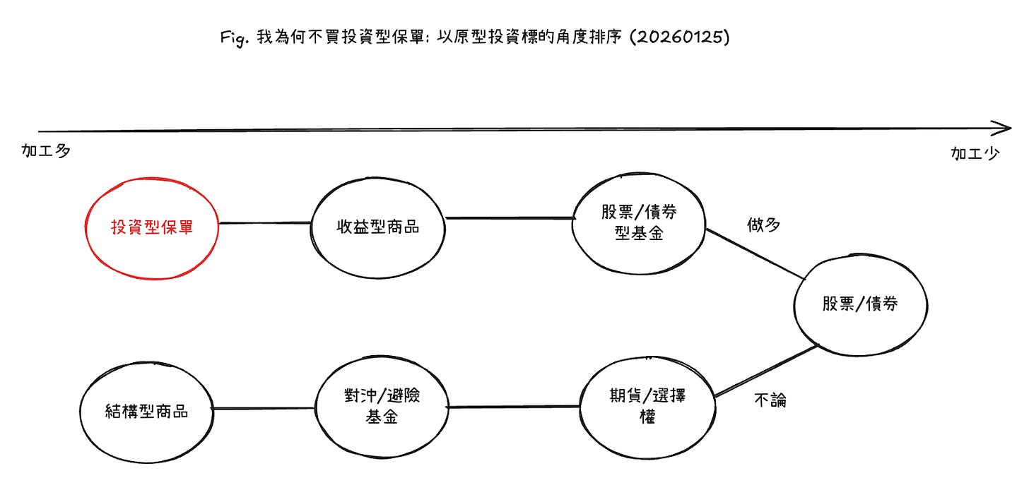前陣子和朋友聊到投資型保單,他一句「投資歸投資,保險歸保險,不要混在一起」讓我深有同感,因為這個原則我已經內化理解好一段時間,但為了回答自己「還記得為何如此理解?」我重新梳理了思考,畫了兩張圖來解釋我的思考。
