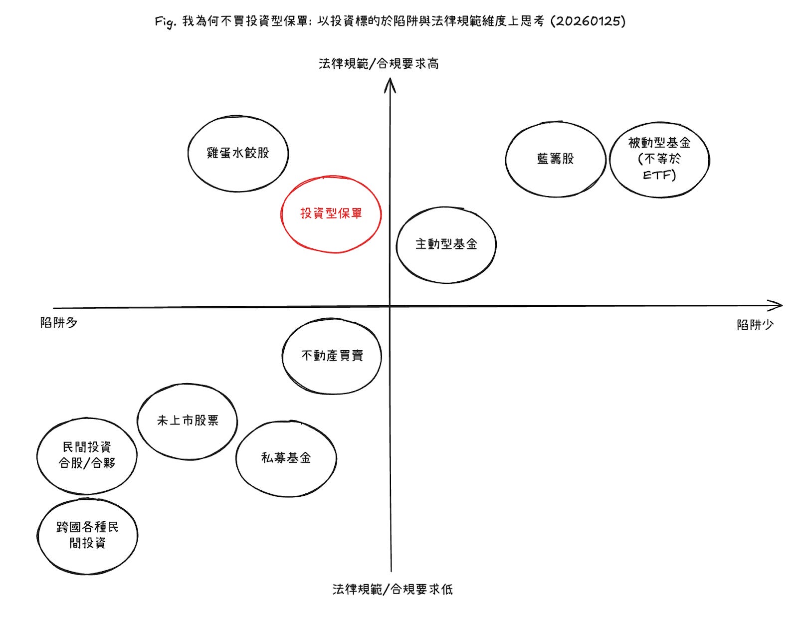 * 左下角(陷阱多、法規保護力低): 例如未上市股票、民間合夥投資。這裡資訊不透明、監管少,等於在裸泳,一般人應極度謹慎。
