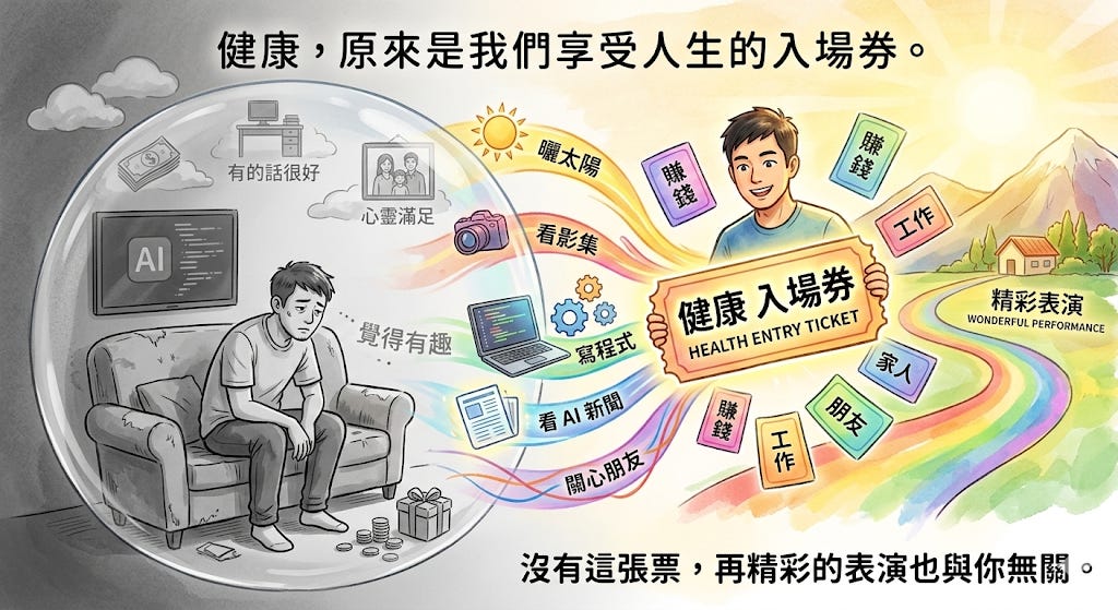 健康,原來是我們享受人生的入場券。沒有這張票,再精彩的表演也與你無關。