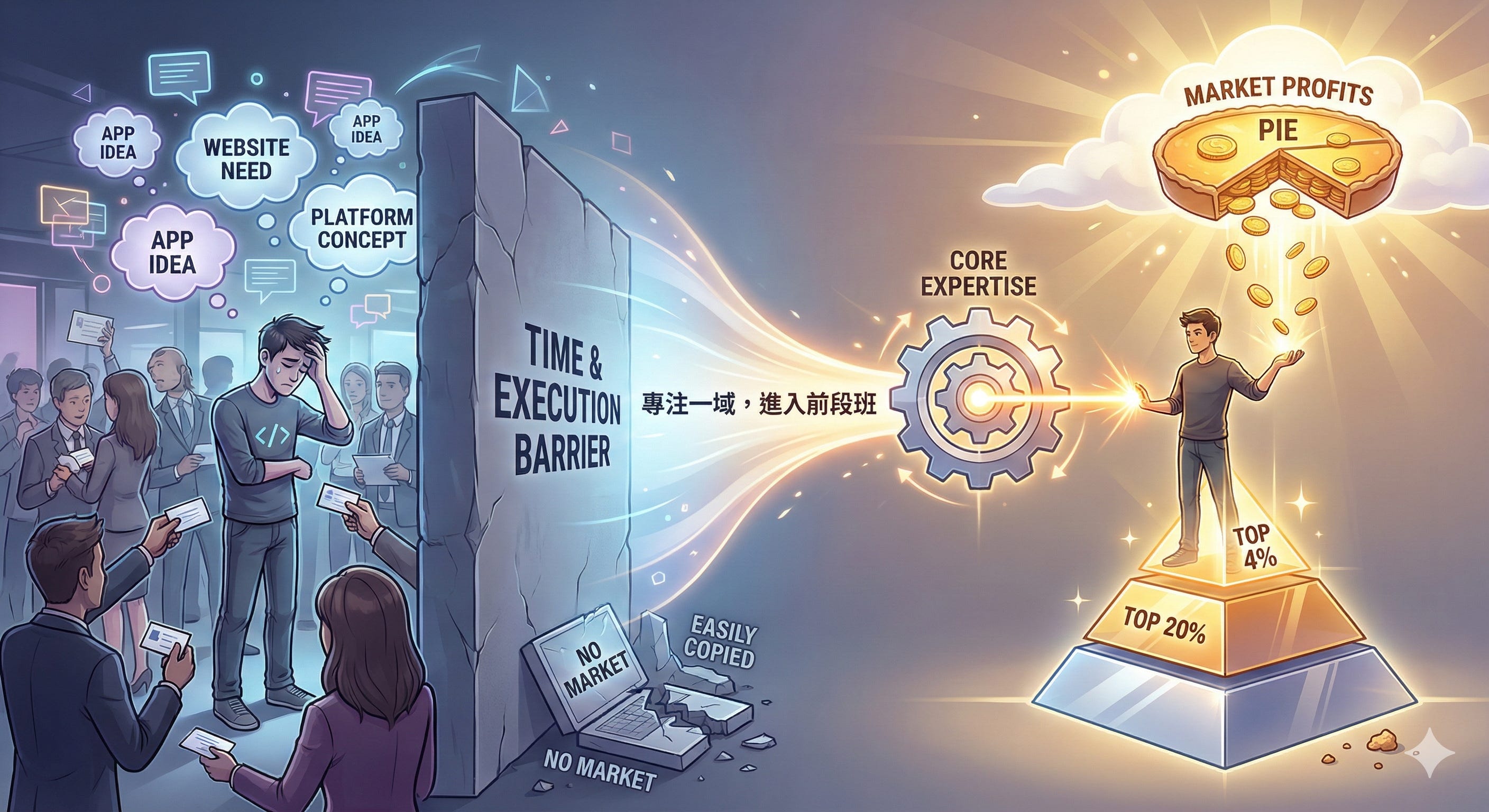 怎麼說呢?我們可以想像每個市場都有一塊「從天而降的大餅」(或者說利潤),但這塊餅只會分配給在這個領域中努力、並且能創造足夠價值的人。前20%的人可能分走80%的利潤;若能擠進前10%甚至前4%(20%之中的20%),你能獲得的回報更是驚人。