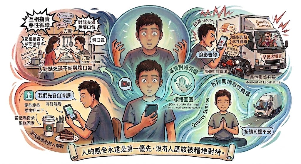 回到家前,我刻意不去讀太太手機傳來的那一串情緒訊息,只簡單回覆:「我們先各自冷靜。」這是我們之間的默契,知道在情緒高漲時,暫時隔離是最好的解決方案。